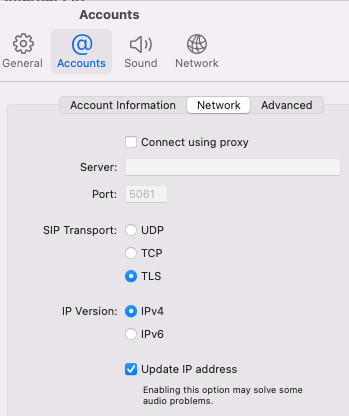 Click on the ‘Network’ tab and under SIP Transport select the ‘TLS’ option (instead of UDP):
